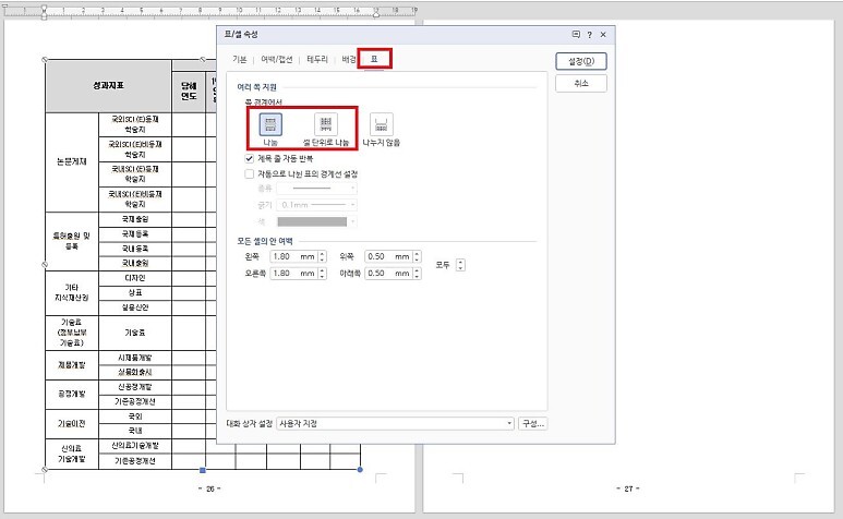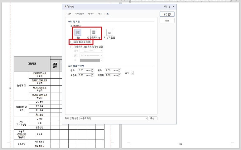 3) '표'탭_나눔 → 제목 줄 자동 반복 해제