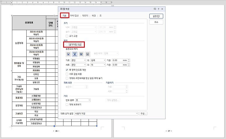 '보기'탭_ 투명선 체크 → 빨간점선 좌더블클릭 → '기본'탭_글자처럼 취급 해제→ '표'탭_나눔 → 제목 줄 자동 반복 해제